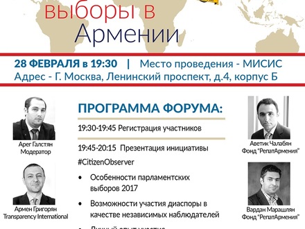 Ս.թ. փետրվարի 28-ին «Քաղաքացի դիտորդ նախաձեռնության» անդամ, Թրանսփարենսի Ինթերնեշնլ հակակոռուպցիոն կենտրոնի (ԹԻՀԿ) ընտրական ծրագրերի համակարգող Արմեն Գրիգորյանը Մոսկվայում մասնակցել է «Սփյուռքը և ընտրությունները Հայաստանում» ֆորումին, որը կազմակերպվել է «Վերադարձ Հայաստան» (Repat Armenia) հիմնադրամի և Մոսկվայի հայ երիտարդների ասոցիացիայի կողմից: