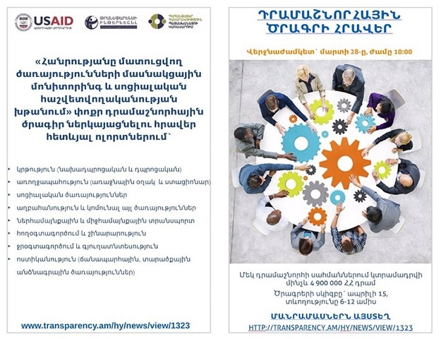 Թրանսփարենսի Ինթերնեշնլ հակակոռուպցիոն կենտրոն ՀԿ-ն ԱՄՆ ՄԶԳ-ի աջակցությամբ իրականացվող «Պահանջատեր հասարակություն՝ հանուն պատասխանատու կառավարման» ծրագրի շրջանակներում հրավիրում է քաղաքացիական հասարակության կազմակերպություններին (ՔՀԿ)՝ ներկայացնելու փոքր դրամաշնորհային ծրագրերի առաջարկներ` հանրությանը մատուցվող ծառայությունների մասնակցային մոնիտորինգի և սոցիալական հաշվետվողականության խթանման մեթոդների կիրառմամբ:
