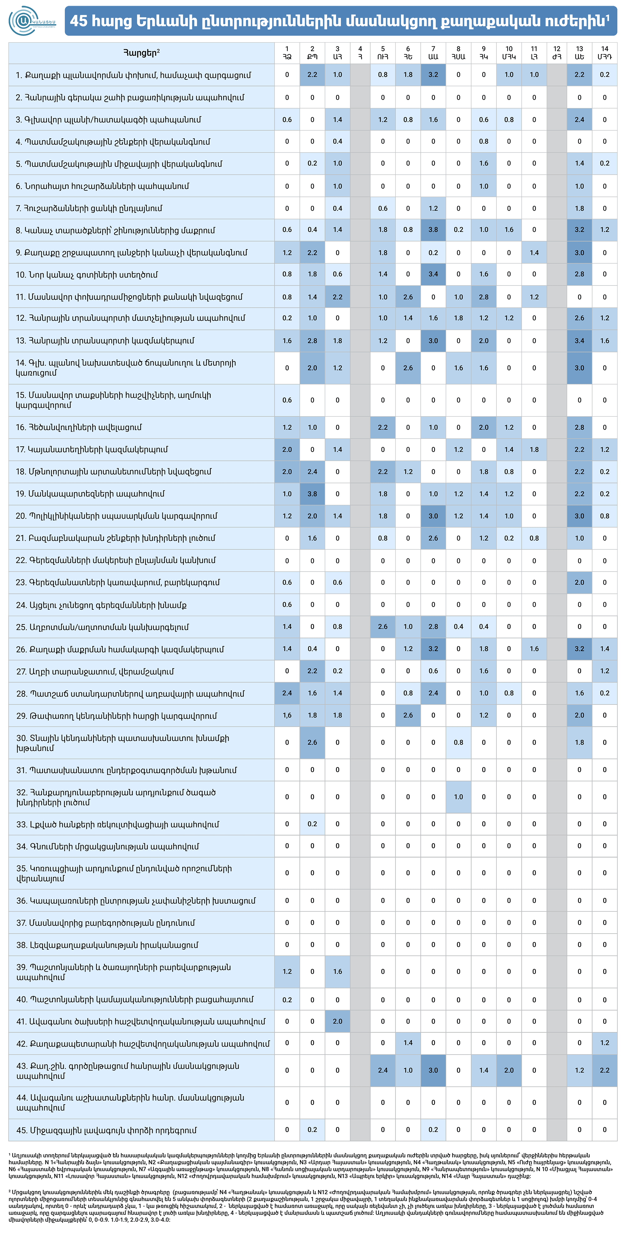 Ստորև ներկայացնում ենք ընտրություններին մասնակցող քաղաքական ուժերի ծրագրերի ուսումնասիրության արդյունքում նշված 45 հարցերի առնչությամբ ստացված պատկերը: