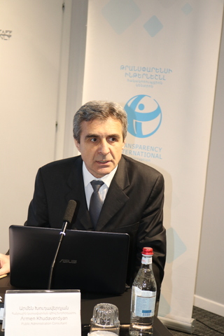 Այնուհետև, ԹԻՀԿ հանրային կառավարման գծով խորհրդատու Արմեն Խուդավերդյանը ներկայացրեց հետազոտության արդյունքները՝ նշելով, որ ԿԿՀ-ի գնահատումն իրականացվել է Թրանսփարենսի Ինթերնեշնլ միջազգային կազմակերպության քարտուղարության կողմից մշակված՝ հակակոռուպցիոն մարմինների գործունեության գնահատման գործիքով՝ միջազգային սկզբունքներից բխող 6 չափման խմբերով՝ 51 ցուցանիշներով: Մասնավորապես, դիտարկվել է Հանձնաժողովի անկախությունը և կարգավիճակը, ապահովվածությունը ֆինանսական և մարդկային ռեսուրսներով, հաշվետվողականությունը և ներքին բարեվարքությունը, հանրային պաշտոնյաների ու ծառայողների բարեվարքության պահանջների պահպանման ապահովումը, կանխարգելման, հակակոռուպցիոն կրթությունն ու հանրային իրազեկումը, ինչպես նաև՝ համագործակցությունն ու արտաքին հարաբերությունները: ԿԿՀ-ի գործունեությունը դիտարկվել է նաև «ՄԱԿ-ի կոռուպցիայի դեմ» կոնվենցիայից բխող պահանջներին և Ջակարտայի հակակոռուպցիոն մարմինների գործունեությանը համապատասխանության տեսանկյունից։