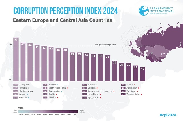 According to the regional division of Transparency International, Armenia is included in the Eastern Europe Central Asia region. Figure 2 shows the Eastern Europe - Central Asia region in 2024. The CPI ranking table includes the calculated scores of all sources for all its countries.
