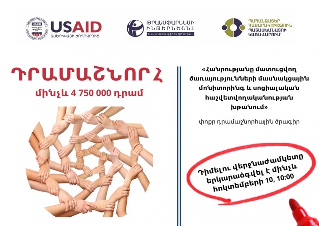 Թրանսփարենսի Ինթերնեշնլ հակակոռուպցիոն կենտրոն ՀԿ-ն ԱՄՆ ՄԶԳ-ի աջակցությամբ իրականացվող «Պահանջատեր հասարակություն՝ հանուն պատասխանատու կառավարման» ծրագրի շրջանակներում հրավիրում է քաղաքացիական հասարակության կազմակերպություններին (ՔՀԿ)՝ ներկայացնելու փոքր դրամաշնորհային ծրագրերի առաջարկներ` հանրությանը մատուցվող ծառայությունների մասնակցային մոնիտորինգի և սոցիալական հաշվետվողականության խթանման մեթոդների կիրառմամբ: