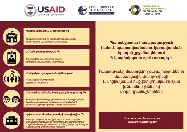 Թրանսփարենսի Ինթերնեշնլ հակակոռուպցիոն կենտրոն ՀԿ-ի՝ ԱՄՆ ՄԶԳ աջակցությամբ իրականացվող «Պահանջատեր հասարակություն՝ հանուն պատասխանատու կառավարման» ծրագրի շրջանակներում հրավիրած «Հանրությանը մատուցվող ծառայությունների մասնակցային մոնիտորինգ և սոցիալական հաշվետվողականության խթանում» երկրորդ մրցույթի արդյունքում, դեկտեմբերի 5-ին դրամաշնորհ են ստացել Հայաստանում գործող հինգ ՀԿ-ներ ստորև ներկայացված առաջարկների համար: