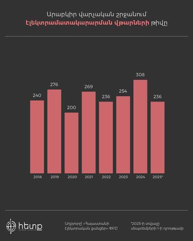 Էլեկտրաէներգիա մատակարարող ընկերության Արաբկիրի սպասարկման տարածքում ամեն տարի առնվազն 200 վթար է տեղի ունենում։ «Հայաստանի էլեկտրական ցանցեր»-ից մեզ չեն տրամադրել վթարների հասցեների և վթարի տեսակի (բնույթի) մասին տվյալներ, որոնցից հնարավոր կլիներ պարզել առաջացած վթարի հնարավոր պատճառը։ ՀԷՑ-ից մեզ տրամադրած տվյալների համաձայն՝ վերջին 6 տարվա ամենաշատ վթարները տեղի են ունեցել 2024 թվականին՝ 308 վթար։ 2015-2025 թվականներին Արաբկիր վարչական շրջանում էլեկտրական ցանցերին է միացել 8657 նոր բաժանորդ։ Ըստ «Հայաստանի էլեկտրական ցանցեր» ընկերության տեխնիկական տնօրեն Դավիթ Գրիգորյանի տրամադրած տվյալների՝ նոր բաժանորդներ են դարձել շահագործման հանձնված 69 բազմաբնակարան շենքերի 4581 բնակարանների սպառողները։ Արաբկիր վարչական շրջանում 2026 և 2027 թվականներին ՀԷՑ-ում ակնկալում են ևս 800 նոր բաժանորդի ավելացում։