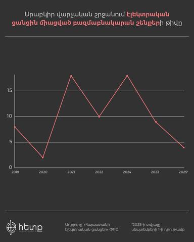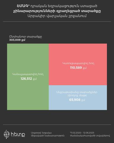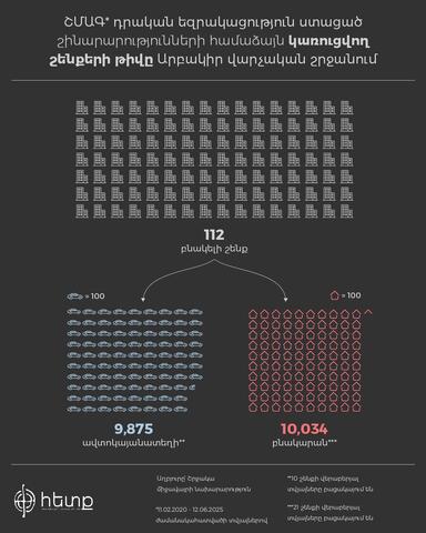 Մենք ուսումնասիրել ենք Արաբկիր վարչական շրջանում կառուցված և կառուցման փուլում գտնվող բազմաբնակարան բնակելի համալիրների 2 տասնյակից ավել քաղաքաշինական ծրագրերի փաստաթղթեր։ Այն ծրագրերի, որոնք անցել են շրջակա միջավայրի վրա ազդեցության փորձաքննություն։ Ըստ այդ ուսումնասիրության՝ Արաբկիրում 25 բնակելի համալիր (յուրաքանյուրը մեկ և ավելի շենք) կառուցելու համար կառուցապատողները դիմել են ՇՄԱԳ փորձաքննության (2020 թ․-ից սկսած)։ Ըստ Շրջակա միջավայրի նախարարության գլխավոր քարտուղար Սերգո Աթանեսյանի գրավոր պատասխանի՝ 2015-2020 թթ․ ընկած ժամանակահատվածում Երևանի Արաբկիր վարչական շրջանում բազմաբնակարան բնակելի համալիրների վերաբերյալ ՇՄ նախարարության «Շրջակա միջավայրի վրա ազդեցության փորձաքննական կենտրոն» ՊՈԱԿ՝ փորձաքննության նպատակով որեւէ փաստաթուղթ չի ներկայացվել։