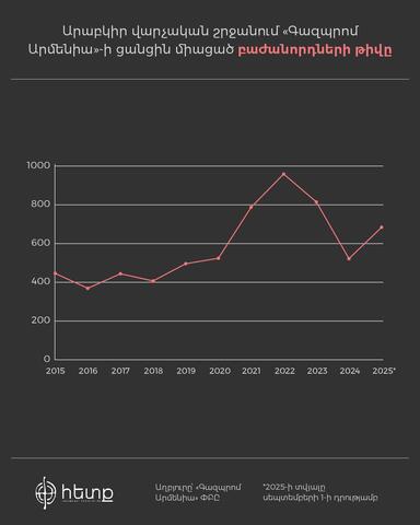 2025 թվականի հոկտեմբերի 1-ի դրությամբ Հայաստանի տարածքում գազ սպառող բնակիչ-բաժանորդների ընդհանուր թիվը 782 786 է, որից 417 486-ը՝ բազմաբնակարան շենքերում, 365 300-ը՝ առանձնատներում: «Գազպրոմ Արմենիա»-ի կանխատեսմամբ այս և առաջիկա 4 տարվա արդյունքներով սպառողների թիվը կավելանա մոտ 73 հազարով։ Ընկերությունը ըստ բնակավայրերի կամ վարչական շրջանների բաժանորդների տվյալների մշակում չի անում։